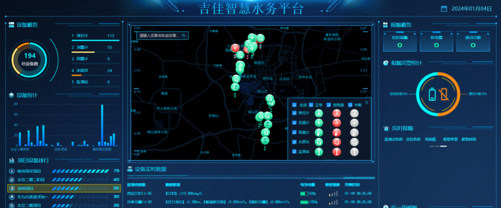 - 城区民生密集区智慧水务平台应用:整合城区670公里雨污水管网信息,重点在居民小区、商业街区等区域部署160套监测设备、134个液位计及8处内涝积水在线监测站,构建全方位监测系统。在2024年多次暴雨天气中,通过平台精准调度处置,优先保障居民区、学校等重点区域排水畅通,实现雨后半小时内城区民生区域积水全部排净,未发生严重积水问题,显著提升了城市防洪排涝能力与民生保障水平。